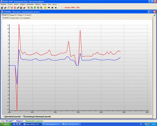 Показатели цены на продукт С значительно выше показателей производственной себестоимости, это свидетельствует о том что производство продукта С будет приносить фирме прибыль. Но в 2004 году в 3 квартале производственная себестоимость повышается, а цена падает.