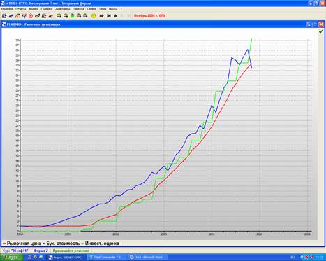 Из графика видно стабильное возрастание бухгалтерской стоимости, данный показатель значительно выше рыночной цены на акцию. Кривая инвестиционной оценки росла небольшими скачками и была то ниже, то выше кривой бухгалтерской стоимости. Только в 1,4 квартале 2003 года, 1 квартала 2004 года инвестиционная оценка выше бухгалтерской стоимости.