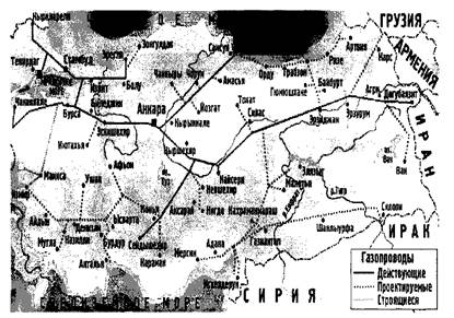 Ввиду расширения ЕС до границ с Россией значение Турции в региональных процессах в Средней Азии и на Ближнем Востоке может значительно возрасти. В силу своего положения на стыке евразийского мира Турция может стать привлекательной страной для коммерческой активности и инвестиций западных нефтяных и газовых предприятий. В случае же практической реализации нефтяных и газовых проектов прикаспийскими странами их успех во многом зависит от действующей и перспективной сети трубопроводов и от ее стабильной и эффективной работы – с тем, чтобы можно было бы осуществить транспортировку нефти и природного газа на мировой рынок. Если западные фирмы, вовлеченные в прикаспийские проекты, придерживаются договоренностей, согласно которым возможно совместное использование месторождений, то вопрос о том, как будет осуществляться транспортировка нефти из региона Каспийского моря на мировой рынок, становится важнее, чем когда бы то ни было. В настоящее время рассматриваются различные проекты трубопроводов: Россия и Иран отвергают нефте- и газопроводы, проходящие через прикаспийский регион. Их планы связаны преимущественно с тем, чтобы направить добываемую там нефть в Персидский залив по маршруту Россия – Казахстан – Туркменистан – Иран.