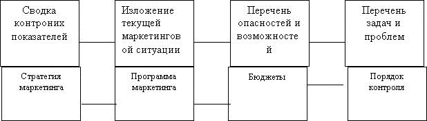 Стратегическое планирование фирмы определяет, какими производствами она будет заниматься и излагает задачи этих производств. Текущий план представляет собой совокупность отдельно разработанных планов по каждому товару и каждому рынку. Разрабатываются планы производства, выпуска товара, планы рыночной деятельности. Все эти планы в совокупности обозначаются одним термином "План маркетинга". Состав элементов плана маркетинга представлен на рис.1.[12]: