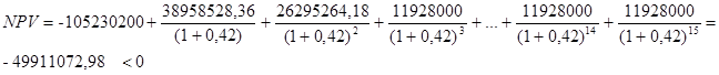 NPVож = 0,3 * 11913828,65+ (1 – 0,3) * (-13220993,25)= -5680546,68 р.