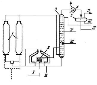 Рис. 2 Принципиальная схема установки замедленного коксования: 1 – коксовые камеры; 2 – нагревательная печь; 3 – ректификационная колонна; 4 – холодильник – конденсатор; 5 – газосепаратор; I – сырье; II – газ; III – вода; IV – бензин; V – легкий газойль; VI – тяжелый газойль; VII – кокс