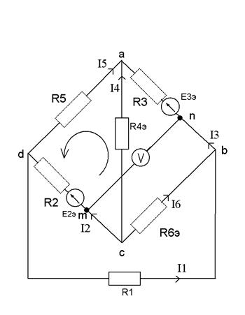 9)Определяем показания вольтметра по второму закону Кирхгофа:
