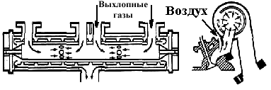 Термический нейтрализатор (рис. 1.4) состоит из корпуса с подводящими (выпускными) патрубками и одной или двух жаровых труб-вставок из жаропрочной листовой стали. Хорошее перемешивание дополнительного воздуха, необходимого для окисления СН и СО, с выпускными газами достигается интенсивным вихреобразованием и турбулизацией газов при перетекании через отверстия в трубах и в результате изменения направления их движения системой перегородок. Для эффективного догорания СО и СН требуется достаточно большое время, поэтому скорость газов в нейтрализаторе задается невысокой, вследствие чего объем его получается сравнительно большим.