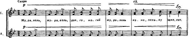 Разрешение наступает только в запеве 1 куплета. Здесь используется IV# ступень (ми бекар), которая добавляет остроты и игривости характеру произведения.