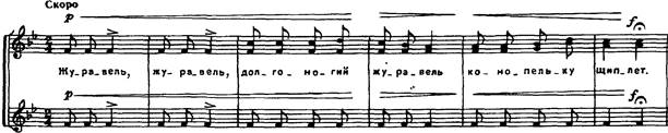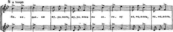 6. Литературный текст ритмически совпадает с мелодией, воспринимается как образ клюющего журавля, штрих staccato