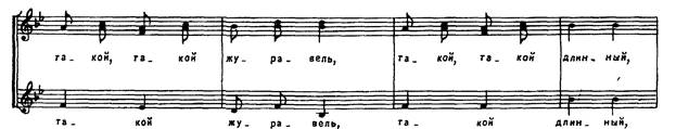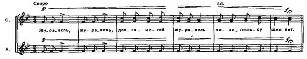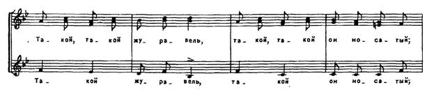 1 куплет – гомофонно-гармонический склад, поступенное мелодическое движение, акценты, яркая динамика, единый ритмический рисунок ( ), создаёт яркое игриво-сердитое настроение, как будто хозяйка жалуется соседям на свою беду, досадует, что журавель повадился щипать её конопель.