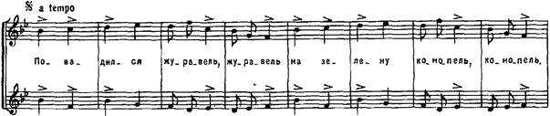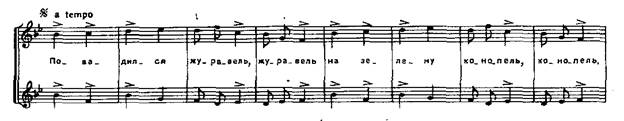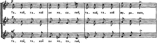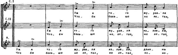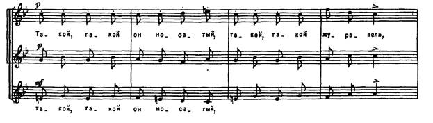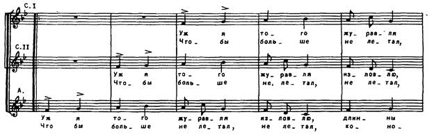 Третье предложение – staccatoвоспринимается как образ клюющего журавля, несмотря на угрозы хозяйки. В этом выступает народный юмор, лукавство.