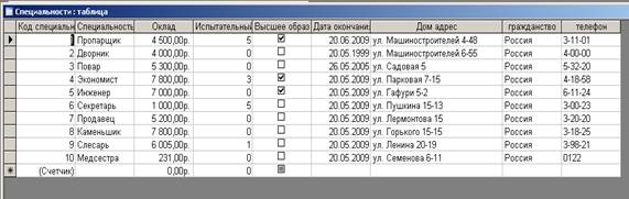 Создать базу данных вакансий рабочих мест Вашей фирмы (предприятия, организации). Задать структуру базы данных, выбрав необходимые тип и размер полей (полей должно быть не менее 8, обязательно присутствие числового, денежного, календарного и логического типов полей). Внести в базу данных информацию не менее, чем на 10 специальностей. Отсортировать список специальностей по алфавиту, создать отчет и распечатать на листе формата А4, включив все поля. Сделать пять различных выборок работников, причем две из них сложных. Распечатать все выборки на листах формата А4. Базу данных представить на дискете.