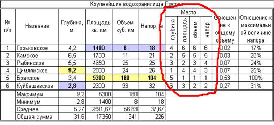 3. Определить какое место занимает каждое водохранилище по каждому параметру.