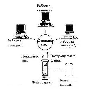 Системы данного типа функционируют в рамках локальных вычислительных сетей (ЛВС), управляемых ОС соответствующего типа. При этом файловый сервер содержит файлы, необходимые для работы приложений и самой СУБД. Однако пользовательские приложения и сама СУБД размещены и функционируют на отдельных рабочих станциях, и обращаются к файловому серверу только по мере необходимости получения доступа к нужным им файлами - как показано на рис. 2. Таким образом, файловый сервер функционирует просто как совместно используемый жесткий диск.