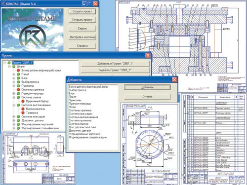 Проект конструкции штампа формируется в виде дерева проекта и отражает номенклатурный состав и технические особенности составляющих элементов конструкции, в качестве которых выступают сборочные единицы (блок, пакет и т.д.) или технологические системы (система крепежа, система фиксации и пр.). Проектирование элементов конструкции выполняется в среде чертежно-конструкторской системы КОМПАС-График под управлением библиотек проектирования системы КОМПАС-Штамп.
