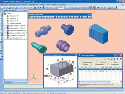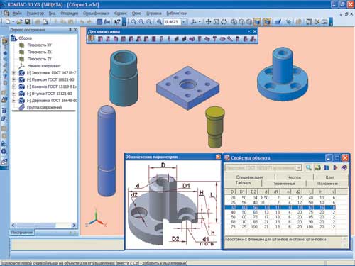 При работе с библиотеками конструктору предоставлены следующие возможности: выбирать размерные параметры деталей из стандартных таблиц; создавать новые детали, вводя произвольные (нестандартные) значения размерных параметров; размещать детали в трехмерной сборке и при необходимости корректировать координаты их привязки; редактировать значения размерных параметров и координаты расположения объектов в сборке на любом этапе работы. При вставке детали в сборку информация о ней автоматически заносится в спецификацию. Для всех деталей предусмотрена возможность автоматического создания деталировочных чертежей.