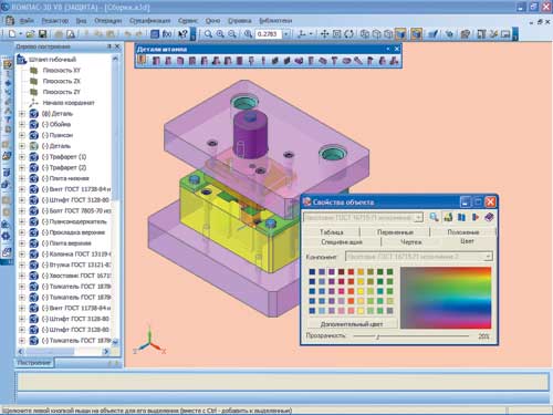 Выбор цвета объекта — задание любого цвета для любого объекта, что существенно упрощает визуальное восприятие (особенно больших и сложных сборок). Выбор цвета осуществляется на вкладке «Цвет» диалога свойств объекта. Указать цвет можно как при вставке объекта в сборку, так и при редактировании его свойств. Широкие функциональные возможности библиотек в сочетании с возможностями системы КОМПАС-3D и разнообразие стандартных и типовых деталей в базах библиотек существенно сокращают затраты времени конструктора на проектирование штампов и пресс-форм, обеспечивают высокое качество документации. Разработчики КОМПАС-Штамп и профильных приложений направляют свои усилия на дальнейшее развитие системы, исходя из пожеланий пользователей и опыта работы системы на предприятиях. А опыт этот уже немалый — заказчиками системы являются более ста предприятий различных отраслей промышленности.