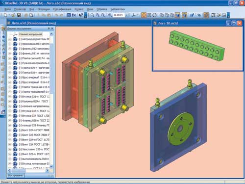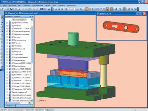 Не отстает от системы КОМПАС-3D и комплекс КОМПАС-Штамп. Для автоматизации проектирования штампов и пресс-форм с использованием трехмерного моделирования были созданы версии 3D-библиотек деталей штампов и деталей пресс-форм.