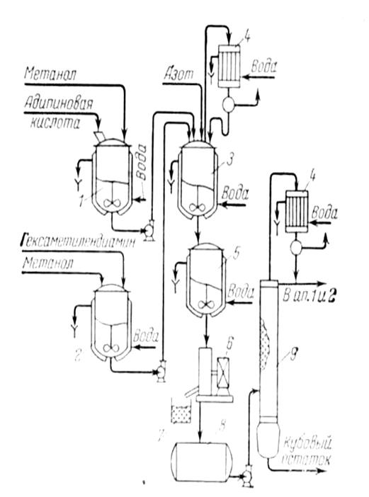 Адіпіновая кислота завантажується в розчинник 13, в нього ж з емністі 12 закачується необхідна кількість метанолу (Рис.4). Розчин адипиновой кислоти з розчинника 13 стислим азотом видавлюється через фільтр 1 в мірник 2. Розчин гексаметилендиамина в метанолі готується в розчиннику 15, в який завантажується гексаметилендиамин і закачується метанол з емністі 12. Для поліпшення розчинення гексаметилендиамина, окрім обігріву розчинника 15 парою через сорочку застосовується циркуляція розчину за допомогою поршневого насосу. Цим же насосом розчин гексаметилендиамина через фільтр 5 подається в мірник 4. В необхідному для реакції співвідношенні розчини адипиновой кислоти і гексаметилендиамина з мірників 2 і 4 зливаються в емальований реактор 14. За рахунок теплоти реакції реакційна маса розігрівається. Необхідна температура в реакторі підтримується охолоджуванням через сорочку і за рахунок випаровування метанолу, пари якого конденсуються в конденсаторі 3. З нього метанол, що сконденсувався, поступає в емність 12.