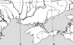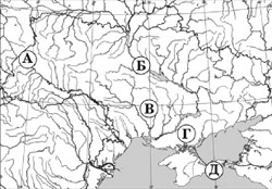 А 48° 30? пн.ш., 35° сх.д. Б 45° пн.ш., 34° 30?сх.д. В 52° пн.ш., 36° 30?сх.д. Г 46° 30? пн.ш., 31° сх.д. Д 49° 30? пн.ш., 25° 30?сх.д.