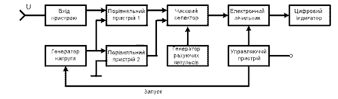 Досліджуваний сигнал Х(t) подається на вхідний пристрій ВхП, що узгоджує рівень сигналу відносно наступних вузлів. Амплітудні селектори АС1 та АС2 виділяють сигнали з амплітудою, яка перевищує заданий поріг селекції. Поріг першого селектора дорівнює Х, другого – Х+ΔХ. На виході селектора АС1 получаються прямокутні імпульси U1, тривалістю Δt1i, яка дорівнює інтервалам часу перевищення рівня Х. На виході селектора АС2 получаються прямокутні імпульси U2, тривалістю Δt2i, яка дорівнює інтервалам часу перевищення рівня Х+ΔХ. Формуючі пристрої ФП1 і ФП2 вирівнюють висоту імпульсів. Вихідна напруга ФП1 усереднюється в блоці усереднення БУ та поступає на реєструючий пристрій РП. Отримане значення пропорційне ординаті функції розподілу F(x) на рівні Х.