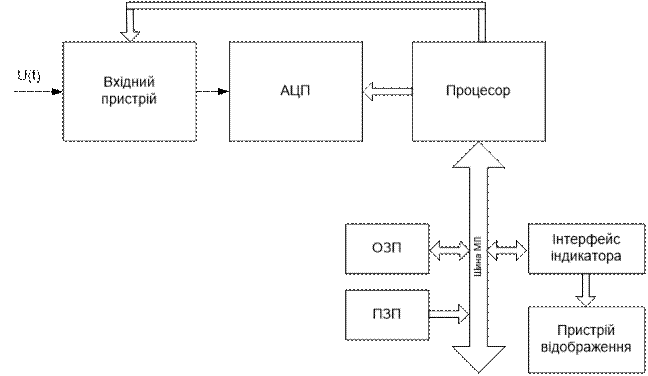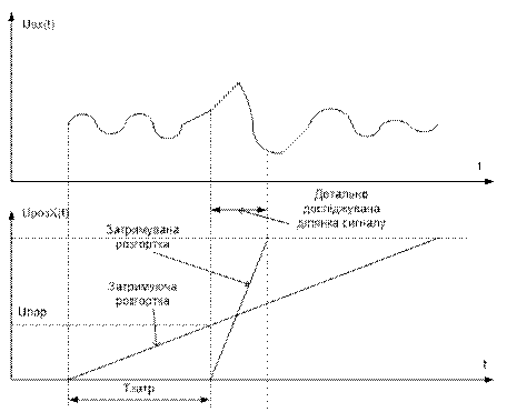 На два вхідні пристрої ВхП1 та ВхП2 подають досліджуваний сигнал. Після цього він подається на входи 1 порівняльних пристроїв ПП1 та ПП2, одночасно на входи 2 цих пристроїв поступають напруги від пристрою встановлення порогу порівняння ВПП на рівні Х та Х+ΔХ. Порівняльні пристрої пропускають напруги реалізації тільки коли відкриваються імпульсами опитування Uоп, які виробляє генератор опитування ГО. Частота цих імпульсів відповідає обраному кроку дискретизації.