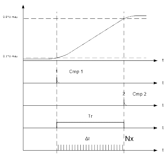 Якщо значення реалізації перевищує встановлений рівень Х, то на виході ПП1 з’являються імпульси U1, кількість яких пропорційна часу перевищення. Аналогічно, якщо значення х(t) перевищує встановлений рівень Х+ ΔХ, то на виході ПП2 з’являються імпульси U2, кількість яких пропорційна часу перевищення. Імпульси U1 та U2 в формуючих пристроях ФП1 та ФП2 перетворюються в ідентичні імпульси однакової полярності і поступають в блок віднімання БВ. Коли значення х(t) перевищує Х+ΔХ, то на обидва входи БВ поступають 2 імпульси, вони віднімаються та на вихід БВ проходять імпульси U3 ,які реєструє цифровий частотомер ЦЧ1. Число n підрахованих імпульсів співпадання за інтервал часу Т пропорційне значенню оцінки густини ймовірності на даному рівні Х. Число імпульсів опитування N реєструється за той же час вимірювання Т цифровим частотомером ЦЧ2. Ордината щільності ймовірності