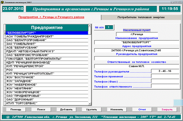 Рисунок 4.2.2.2. Подраздел базы данных КУП «Теплосеть» «Тепловая инспекция»: база данных потребителей теплоэнергии и горячей воды.