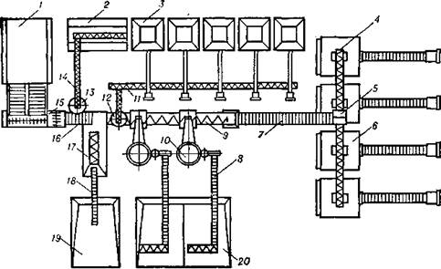 Силос или зеленую массу доставляют к цеху мобильным транспортом и разгружают в питатель 1, откуда масса по транспортёру 16 через дозатор 15 подаётся в агрегат (АПК-10А) 17 для доизмельчения. Одновременно в этот агрегат транспортёром 18 подаются корнеплоды из завальной ямы 19. Их частично моют в завальной яме, а окончательно - в агрегате АПК-IDA, чтобы загрязнённость корма была не более 1,2%. Измельчённые корма подаются на линию сбора кормов 9 и 7. Сюда же через дозаторы 12 и 13 из бункеров 2 и 3 по конвейерам 11 и 14 поступают травяная мука и концентраты. Картофель из завальных ям 20 транспортёрами 8 подаётся в агрегат (АЗК-3) 10, где очищается от посторонних примесей, моется, запаривается, мнётся и затем выгружается на линию сбора. После мойки загрязнённость картофеля не должна превышать 3%, а расход поды на 1 т корма - 480 кг.