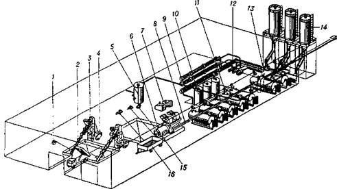 Схема размещения оборудования КПО-150: 1 - электролебедка; 2 - ковшовый погрузчик кормов; 3 - магнитная колонка; 4 - дробилка пищевых отходов; 5 - приёмный резервуар для молода; 6 - сепаратор пищевых отходов; 7 - пульт управления электроприводами кормоцеха; 8 - шнековый загрузчик; 9 - теплообменник; 10 - продувочный котёл; 11 - запарники-смесители; 12 - фекальный насос; 13 - цепной транспортёр; 14 - бункер-накопитель; /5 - центробежный насос; 16 - тележка для удаления примесей.