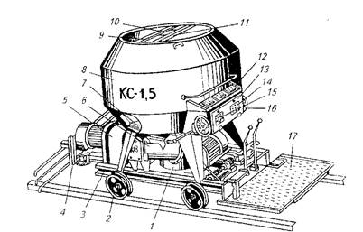 1-разделительная коробка; 2 - ходовая часть; 3 - рама; 4 - устройство автоматической остановки кормораздатчика; 5 - мотор - редуктор; 6 - выгрузной шнек; 7 - лопастная мешалка; 8 - бункер; 9 - травесна; 10 - шнек - мешалка; 11 - разравнитель; 12 - пульт управления; 13 - электрооборудование; 14 - таблица нормы выдачи кормов; 15 - шкала; 16 - штурвала; 17 - площадка для рабочего.