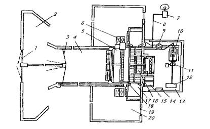 Размещение технологического оборудования кормоцеха КС-24: 1 - питатель зелёной массы; 2 - бункер-питатель травяной муки; 3 - бункер сухих кормов; 4,9 - шнековые транспортёры; 5 - перекидной клапан; 6 - смеситель (запарник); 7,8,16 - наклонные скребковые транспортёры; 10 - картофелезапарник (агрегат АЗК-3); 11,14 - шнековые конвейеры; 12,13 - дозаторы концентратов; 15 - дозатор стебельчатых кормов; 17 - кормоприготовительный агрегат; 18 - ковшовый транспортёр; 19,20 - завальные ямы (кормоприёмники)