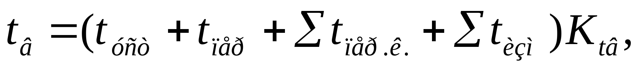 to=0,107+0,106+0,29+0,004=0,507 мин, tуст=0,20 мин, tпер=0,08+0,06=0,14 мин, tпер.к.=(0,01+0,05+0,06)4=0,48 мин, tизм=0,11 мин. (Методические указания, приложения 7…11)  Время на обслуживание рабочего места: tобс =2% tопер tобс =( tо+ tв)2/100=(0,507+0,93)2/100=0,0287 мин. (приложения 7…11) Время на отдых и личные надобности: tотд =3,5% tопер tотд =( tо+ tв)3,5/100=(0,507+0,93)3,5/100=0,05 мин. (приложения 7…11) Штучное время: