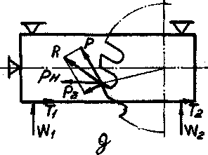При фрезеровании торцевой фрезой заготовку устанавливают основанием на три опоры, а боковой и торцевой поверхностями подводят к трём другим опорам (рис.9). Применяемые два зажима, действующие нормально к поверхности заготовки, должны создать силы зажима W1 и W2, препятствующие перемещению обрабатываемой заготовки под действием горизонтальной составляющей Рн силы резания. Обычно силы W1 и W2 зажима равны, и следовательно, силы трения Т1 и Т2 тоже равны.