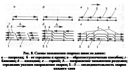 По длине сварные швы выполняют напроход и обратно-ступенчатым способом (рис. 8).