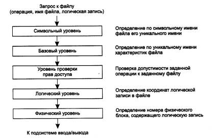 Многоуровневый подход к описанию и реализации функций системы применяется не только в отношении сетевых средств. Такая модель функционирования используется, например, в локальных файловых системах, когда поступивший запрос на доступ к файлу последовательно обрабатывается несколькими программными уровнями (рис. 1.22). Запрос вначале анализируется верхним уровнем, на котором осуществляется последовательный разбор составного символьного имени файла и определение уникального идентификатора файла. Следующий уровень находит по уникальному имени все основные характеристики файла: адрес, атрибуты доступа и т. п. Затем на более низком уровне осуществляется проверка прав доступа к этому файлу, а далее, после расчета координат области файла, содержащей требуемые данные, выполняется физический обмен с внешним устройством с помощью драйвера диска.