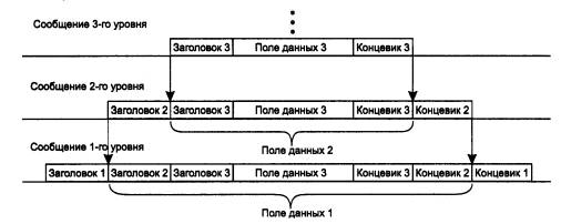 После формирования сообщения прикладной уровень направляет его вниз по стеку представительному уровню. Протокол представительного уровня на основании информации, полученной из заголовка прикладного уровня, выполняет требуемые действия и добавляет к сообщению собственную служебную информацию - заголовок представительного уровня, в котором содержатся указания для протокола представительного уровня машины-адресата. Полученное в результате сообщение передается вниз сеансовому уровню, который в свою очередь добавляет свой заголовок, и т. д. (Некоторые реализации протоколов помещают служебную информацию не только в начале сообщения в виде заголовка, но и в конце, в виде так называемого «концевика».) Наконец, сообщение достигает нижнего, физического уровня, который собственно и передает его по линиям связи машине-адресату. К этому моменту сообщение «обрастает» заголовками всех уровней (рис. 1.26).