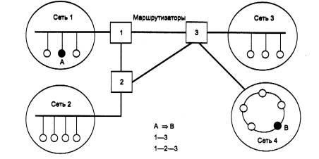 На рис. 1.27 показаны четыре сети, связанные тремя маршрутизаторами. Между узлами А и В данной сети пролегают два маршрута: первый через маршрутизаторы 1 и 3, а второй через маршрутизаторы 1, 2 и 3.