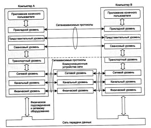 Многоуровневое представление средств сетевого взаимодействия имеет свою специфику, связанную с тем, что в процессе обмена сообщениями участвуют две машины, то есть в данном случае необходимо организовать согласованную работу двух «иерархий». При передаче сообщений оба участника сетевого обмена должны принять множество соглашений. Например, они должны согласовать уровни и форму электрических сигналов, способ определения длины сообщений, договориться о методах контроля достоверности и т. п. Другими словами, соглашения должны быть приняты для всех уровней, начиная от самого низкого - уровня передачи битов - до самого высокого, реализующего сервис для пользователей сети.