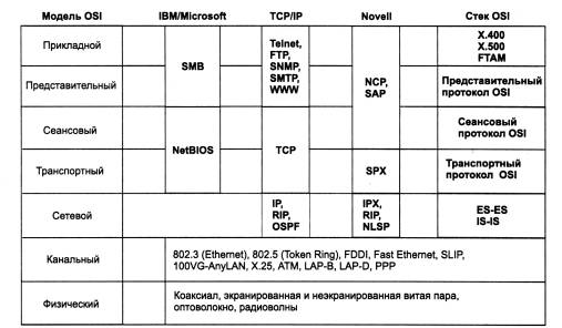 Важнейшим направлением стандартизации в области вычислительных сетей является стандартизация коммуникационных протоколов. В настоящее время в сетях используется большое количество стеков коммуникационных протоколов. Наиболее популярными являются стеки: TCP/IP, IPX/SPX, NetBIOS/SMB, DECnet, SNA и OSI. Все эти стеки, кроме SNA на нижних уровнях - физическом и канальном, - используют одни и те же хорошо стандартизованные протоколы Ethernet, Token Ring, FDDI и некоторые другие, которые позволяют использовать во всех сетях одну и ту же аппаратуру. Зато на верхних уровнях все стеки работают по своим собственным протоколам. Эти протоколы часто не соответствуют рекомендуемому моделью OSI разбиению на уровни. В частности, функции сеансового и представительного уровня, как правило, объединены с прикладным уровнем. Такое несоответствие связано с тем, что модель OSI появилась как результат обобщения уже существующих и реально используемых стеков, а не наоборот.