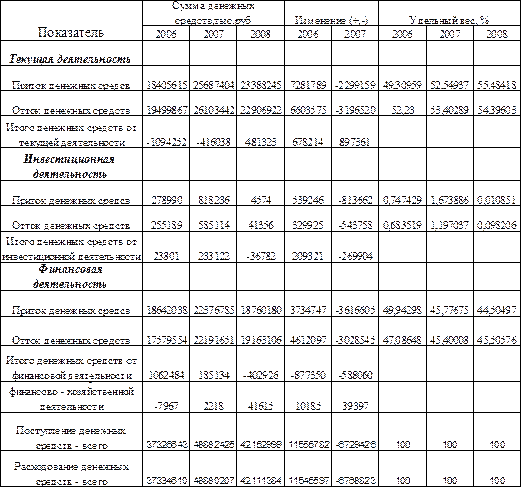 Анализ денежных потоков в ОАО «Алтай-кокс» прямым методом (основой расчета является выручка от реализации продукции) показывает тенденцию увеличения денежного потока за период с 2004 г. по 2006 г. Так в 2006 г. в ОАО «Алтай-кокс» наблюдался дефицит денежных средств, в 2007 г. и 2008г. - избыток денежных средств.