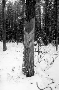 | Рис.21. Подсочка сосны. На дерево наносятся специальные насечки, подновляющиеся в течение 5-10 лет, по которым в специальную воронку стекает смола. |