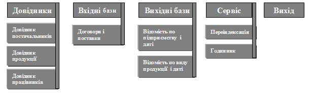 Вихідні відомості формуються з попереднім запитом у вікні про підприємство і дату у 1-й відомості, про продукцію і дату у 2-й відомості. Вони виводяться в рапорті у вигляді документу формату А-5 з усіма полями, які присутні в оперативній базі даних (додатково оформити поля: адреса постачальника, професія працівника; ВАРТІСТЬ: Kil* PRO_cina;). Назва програмних файлів, які обробляють бази даних однойменні з dbf-файлів. Вихід здійснюється в середовище операційної системи.