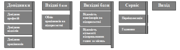Вихідні відомості формуються з попереднім запитом у вікні про відділ у 1-й відомості, про період і прізвище у 2-й відомості. Вони виводяться в рапорті у вигляді документу формату А-4 з усіма полями, які присутні в оперативній базі даних (додатково оформити поля в 1-й і 2-й відомостях, які є довіднику працівників — особові дані). Назва програмних файлів, які обробляють бази даних однойменні з dbf-файлів. Вихід здійснюється в середовище операційної системи. До довідника працівників створити вікно для добавлення і зміни запису.