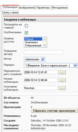 Рис. 13. Страница редактирования «объекта содержимого»: Параметры публикации