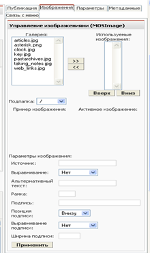 Если необходимо поместить изображения в статьи, то можно использовать специальную возможность вставки изображений. Нажмите кнопку «Вставить изображение» (кнопка расположена внизу слева окна HTML редактора), после этого в содержимое будет добавлен текст {mosimage}; при обработке этого текста для отображения система (Joomla) определит, что необходимо вставлять изображения, список которых размещен на вкладке «Параметры изображений» (Рис. 14). Чтобы увидеть изображение в тексте, нажмите кнопку «Просмотр» на панели инструментов.