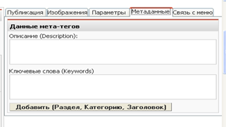 Если использовать кнопку «Добавить (Раздел, Категория, Заголовок)», то будут добавлены в поле «Ключевые слова» названия раздела, категории и заголовок объекта.
