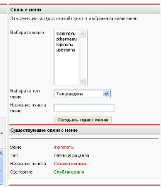 Самый простой вариант (но ограниченный в возможностях) связать объект содержимого с пунктом меню, это использовать на странице редактирования объекта содержимого в окне дополнительных параметров вкладку «Параметры связи с меню». Во вкладке данного окна необходимо: