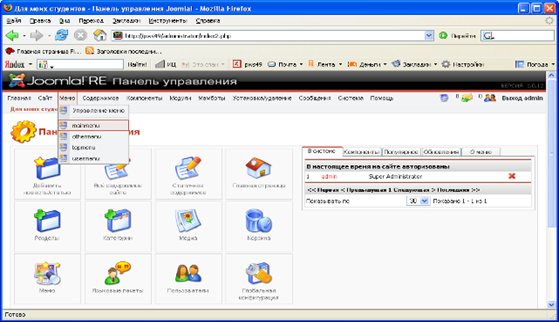 Для работы с пунктами меню определенного меню (например, mainmenu) необходимо перейти на страницу «Управление меню [mainmenu]». В основном меню выбрать «Меню», затем пункт меню «mainmenu».