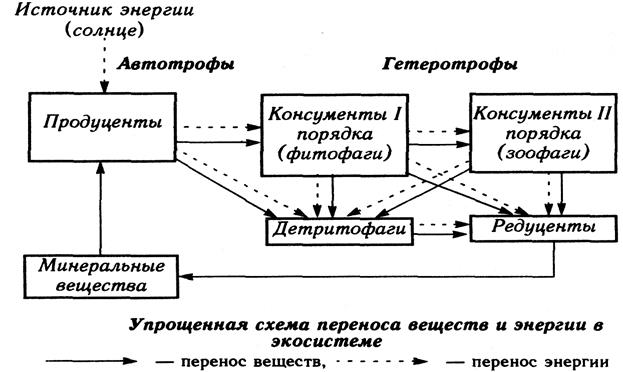 Учитывая характер трансформации энергии и вещества, можно выделить следующие элементы, или блоки, экосистемы: