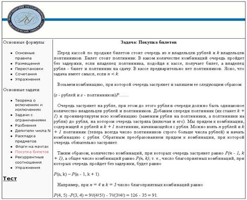 В теоретической части рассматриваются такие основные элементы классической комбинаторики как, размещения, перестановки и сочетания, а так же рассматриваются некоторые классы наиболее часто встречающихся задач: комбинаторные задачи с ограничениями, комбинаторные задачи раскладок и разбиений, комбинаторные задачи, решаемые с помощью рекуррентных соотношений.