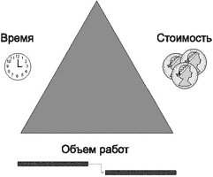 Більшість проектів мають певні дату закінчення, бюджет і обсяг робіт. Це тріо часу, грошей і обсягу робіт часто називають проектним трикутником (рис. 1), тому що при внесенні змін в один з цих елементів змінюються обидва інших. І хоча для проекту в рівній мірі важливі всі три елементи, як правило, тільки один з них залежно від пріоритетів має найбільший вплив на інші.