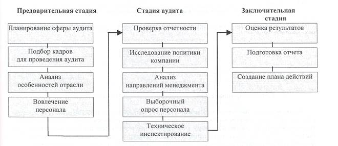 План проведения эко-аудита включает, как правило, следующие основные стадии: